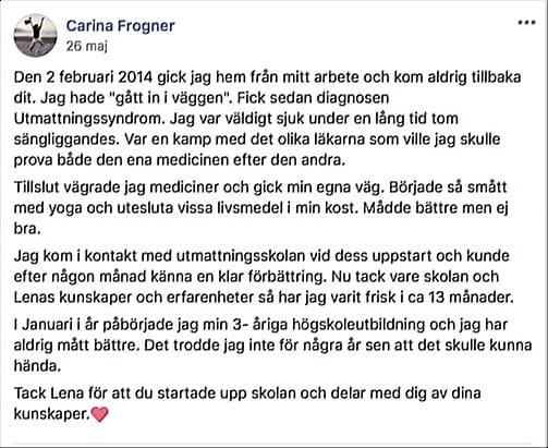 UMS startade i juli 2016, och bakom oss har vi människor som i starten låg på sjukhus med dropp, och som idag är friska. Några av dem talar ut i boken ”Äntligen fri från utmattning!”