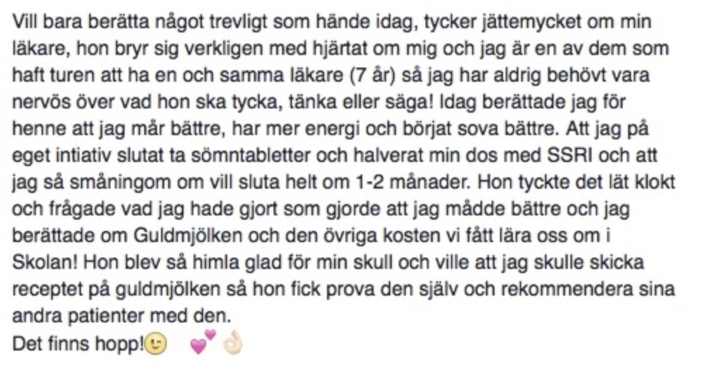 “Jättefin föreläsning som inger hopp. Jag ska försöka ta till mig av detta. Problemet är att jag är så slut nu. Tack fina. Orkar inte skriva mer just nu, trött, trött… Stor kram.”