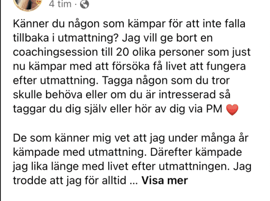 Känner du någon som kämpar för att inte falla tillbaka i utmattning? Jag vill ge bort en coachingsession till 20 olika personer som just nu kämpar med att försöka få livet att fungera efter utmattning. Tagga någon som du tror skulle behöva eller om du är intresserad så taggar du dig själv eller hör av dig via PM