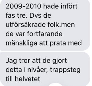 ”Det vore fantastiskt om detta kunde ge rätt till så många som blivit felbedömda. Jag jobbar numera som handledare/projektledare inom hantverk för långtidssjukskrivna och det är oroväckande vanligt att personer blivit utskrivna och ofta hänvisade till Arbetsförmedlingen som anser att de är för sjuka för att jobba. De hamnar mellan myndigheterna och utan ersättning de borde ha rätt till.”