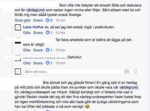 Nu blev jag intresserad! Jag frågade medlemmarna på vår stora skogård vad det där är för nåt?!? Värdegrund?!? Jag är pensionerad, och befinner mig utomlands, och har mycket lite kontakt med ”värdegrundsarbete”, som kvinnan talat om.